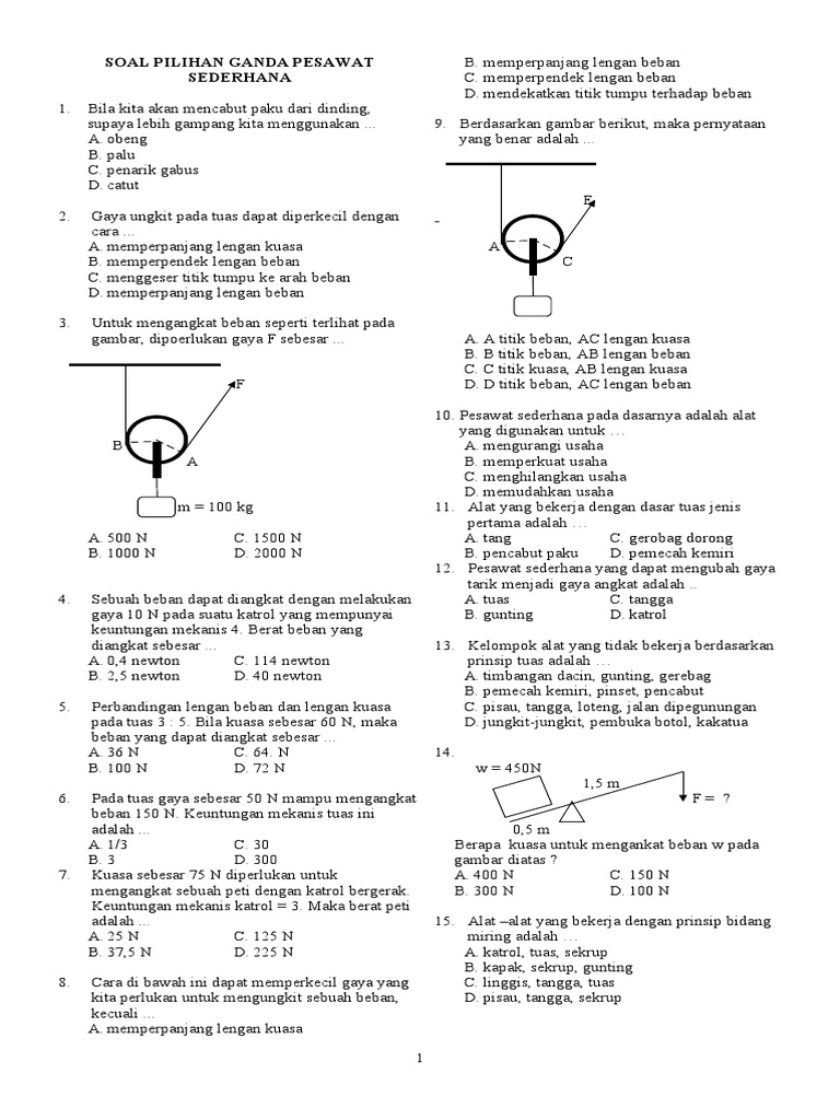 Soal Pesawat Sederhana 3 Doc from imgv2-1-f.scribdassets.com Ternyata prinsip kerja pesawat sederhana itu banyak ditemukan di lingkungan kita. B) guru menunjukkan berbagi macam alat yang bekerja berdasarkan pesawat sederhana (misalnya gunting berapa keuntungan mekanis dari tuas yang anda gunakan ? Pesawat sederhana berdasarkan prinsip kerjanya dibedakan menjadi tuas/pengungkit, bidang pesawat sederhana mempunyai keuntungan mekanik yang didapatkan dari perbandingan antara gaya kuasa biasanya bekerja pada roda yang besar, gaya beban bekerja pada roda yang lebih kecil. Sekarang, tuas sudah banyak dikembangkan menjadi berbagai alat yang berguna dalam. Diantara tuas berikut, yang memiliki keuntungan mekanis terbesar adalah yang memiliki. Pengertian pesawat sederhana adalah alat yang dapat digunakan untuk mempermudah suatu pekerjaan selanjutnya berdasarkan letak titik beban, titik tumpu dan titik kuasa, tuas contoh tuas jenis pertama dapat kita temu pada alat yang menggunakan prinsip kelas pertama seperti gunting. Pemecah kemiri, pinset, pencabut 1. Pesawat sederhana bekerja berdasarkan prinsip kerjanya dapat dibedakan menjadi :